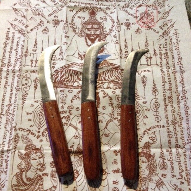 We search the world for quality, high grade, fair trade organic herbal and medicinal products and herbalism is our mission, religion, way of life. We seek out the best teachers, the best texts, the best packaging, the best handblown glass and handmade pottery to create our medicines. We also grow and wildcraft as much of our herbs as possible. We are constantly testing various tools and indigenous methods for clean, efficient and ethical harvesting. When we learned of this special knife we present here, it was from one of our most cherished herbalist suppliers and teachers from Thailand, true hermit lersi master of the occult and botanical arts of several traditions and lineages. This is an amazing curved blade, reminding me of those real herbalist crescent knives of the peasant cunning folks and root diggers of old pagan Europe. It’s a solid steel in a reclaimed exotic Thai wood handle, riveted with brass pins and honed of high quality reclaim upcycled blades of things like lawnmowers and old plow metal by the tribal metal smiths. It is the perfect lightweight, efficient, easily sharpened and holding its edge type knife for serious harvesting, weeding, light pruning, and even to get at your fruit or other light garden work. These are sturdy, super sharp and wonderful blades, a cross between a boline and hand scythe, like a mini-machete. There are many such knives around but these are the best and supporting an authentic, living legend of an herbalist master. Knife is 8.5″, blade is 4″.