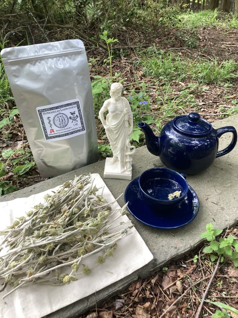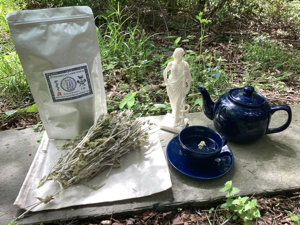 This is our daily relaxing, calming tea for mood and mindfulness, for combatting stress and the toxins, the allergens and triggering ailments that aggregate to disease and discomfort. It is a holy tea of the Son of Hyperborean Apollo, Asklepias and aid to dreams and restful sleep as well.